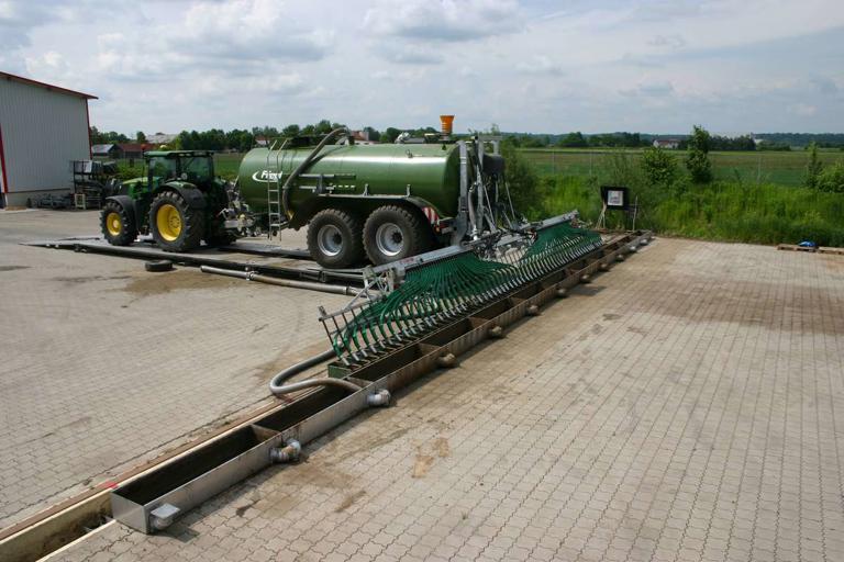 The manure distributor SKATE 150 mounted to a PFW Jumbo Line Plus 18000 was put through its paces on Fliegl’s own test bench. The modules "Function and operating principle" as well as "Handling, operation and maintenance" were assessed. The first includes the quality of the lateral distribution of cattle and pig manure and the determination of the time it takes for the manure to reach all outlets at the beginning of an application run. The second module evaluates how and with what effort the typical operating steps and more frequent maintenance work can be carried out.