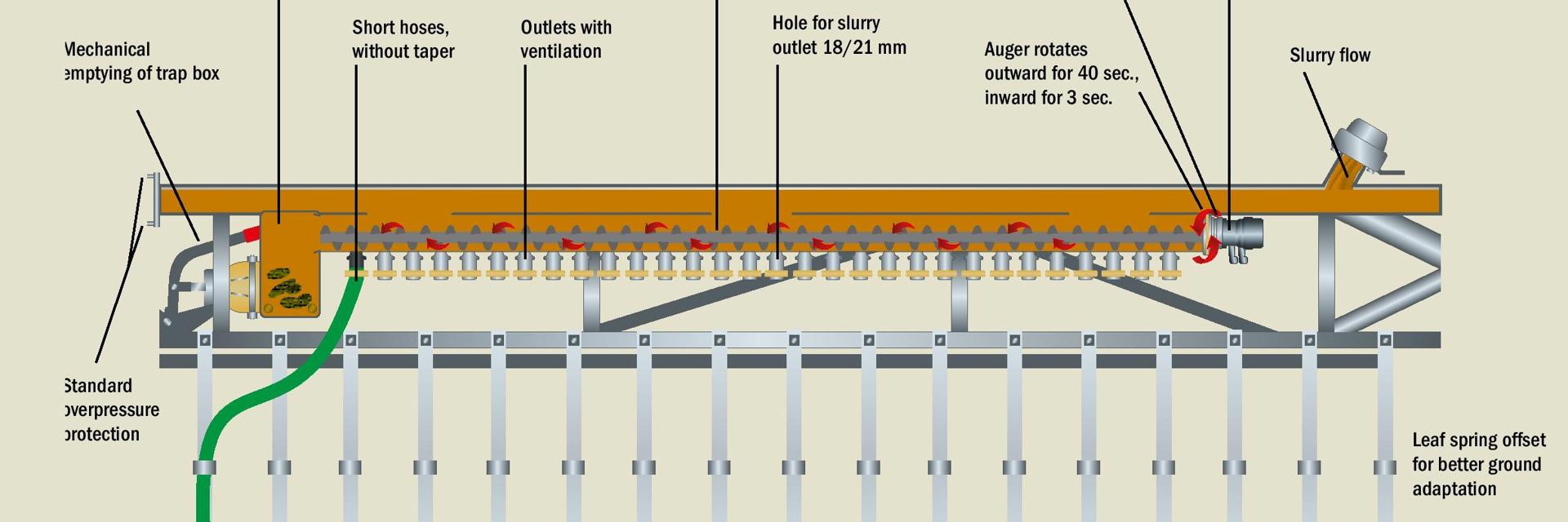 The system is designed to guide foreign objects such as stones, ear tags, wood chips etc. to trap/storage boxes at the ends of each distribution boom. Operating at 50-60rpm, the screw auger operates on a timing relay to rotate outwards for 40 seconds, then in reverse again for 5 seconds to keep the hose outlets clear of debris. The trap boxes can be mechanically or hydraulically emptied where potential hose blocking material is then disposed.