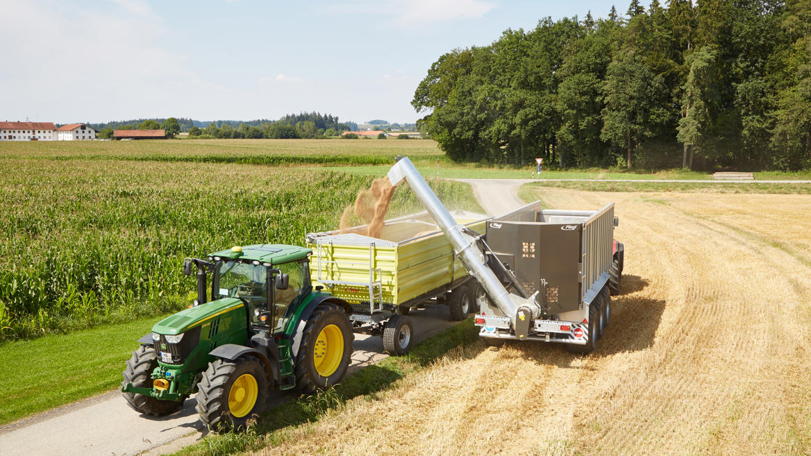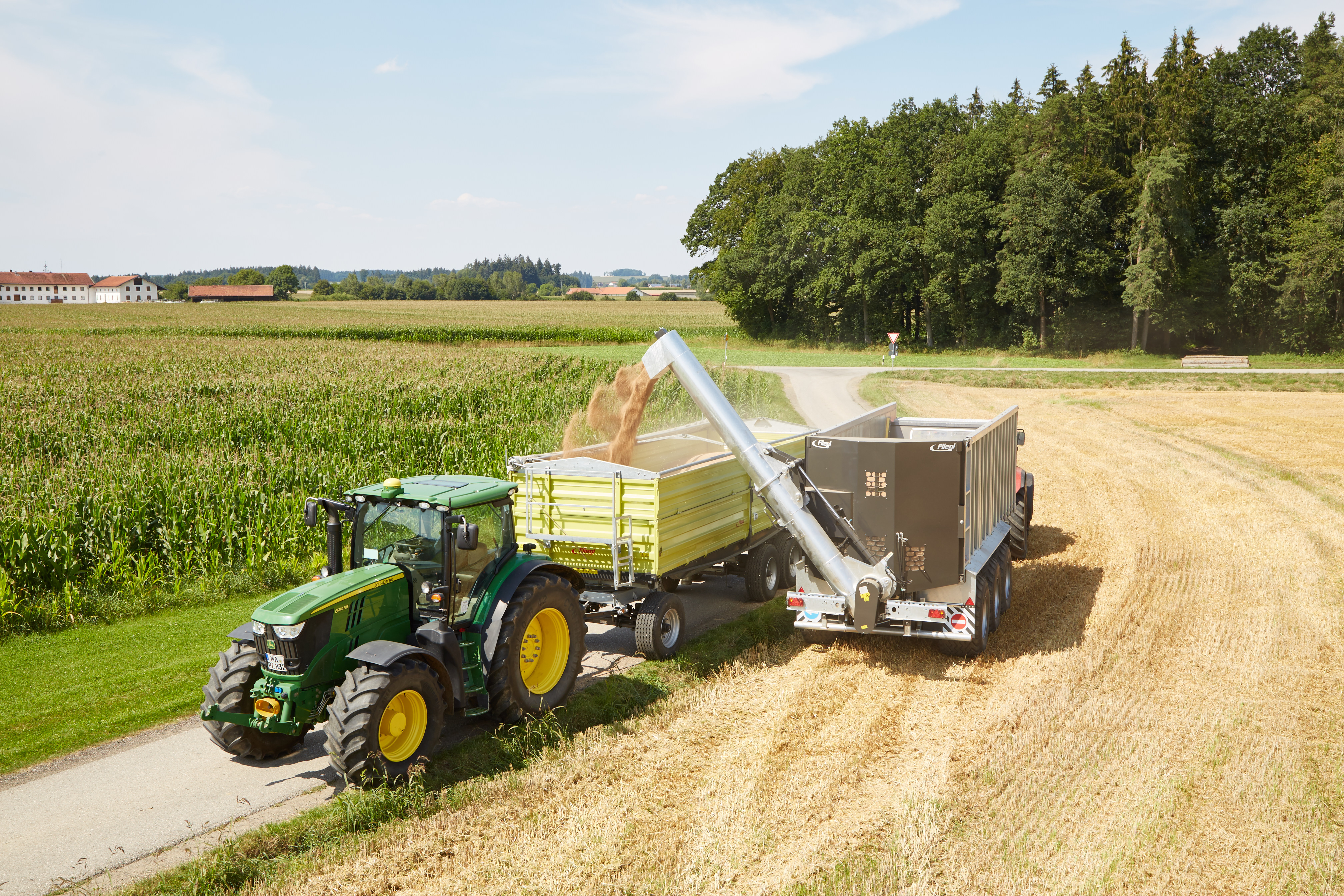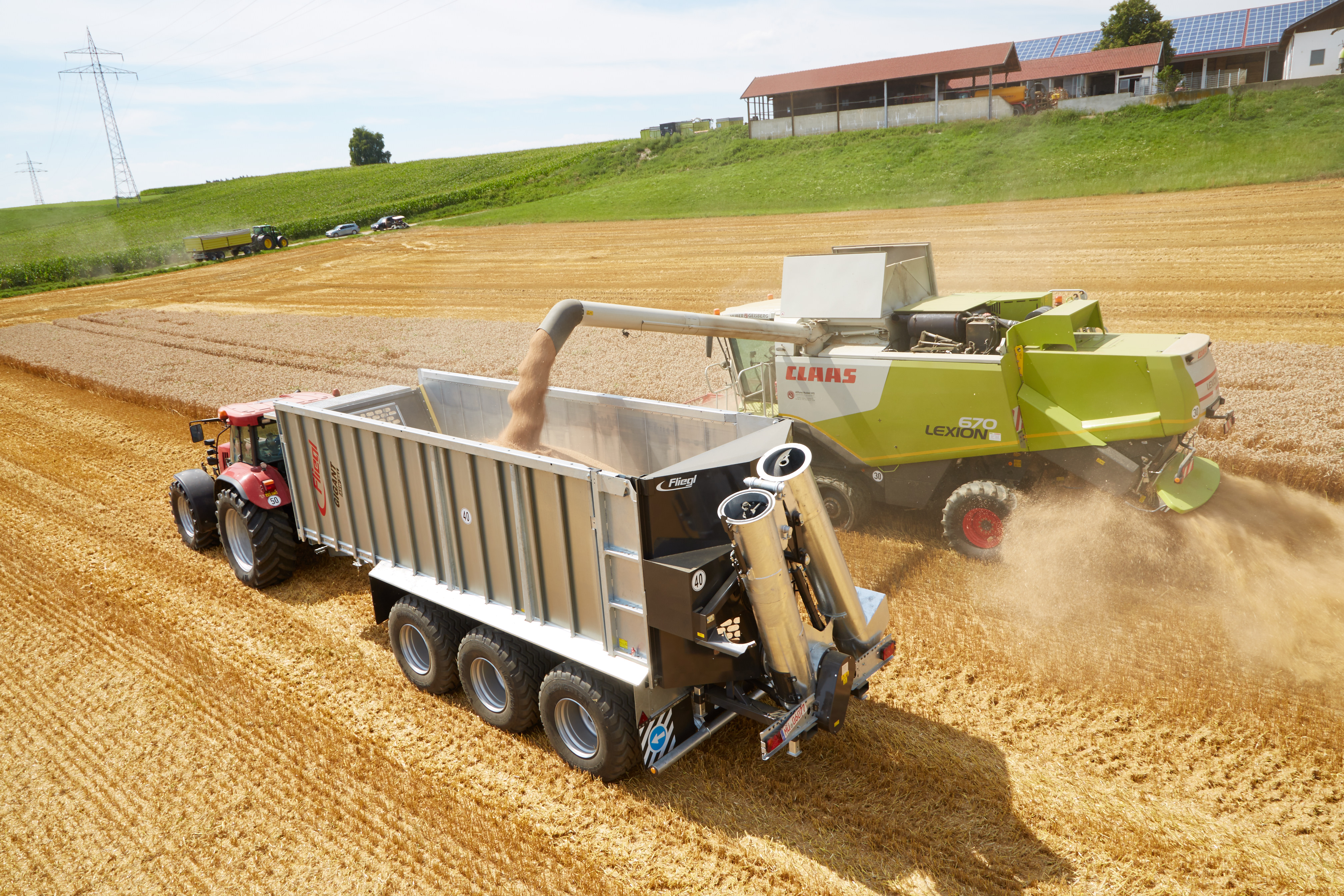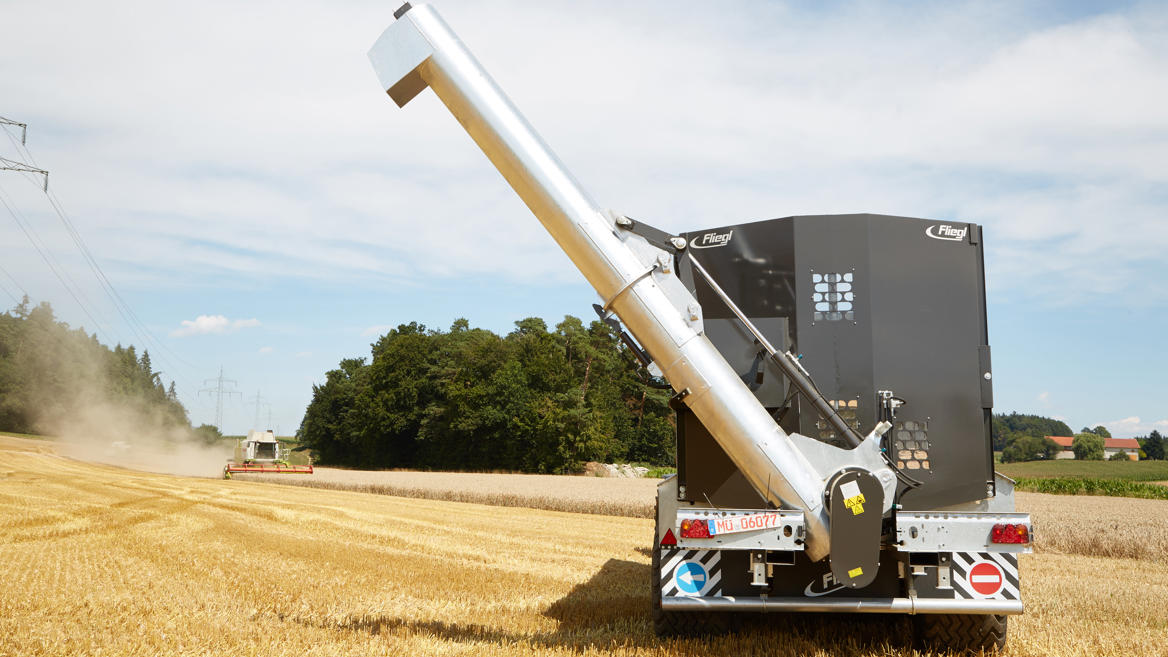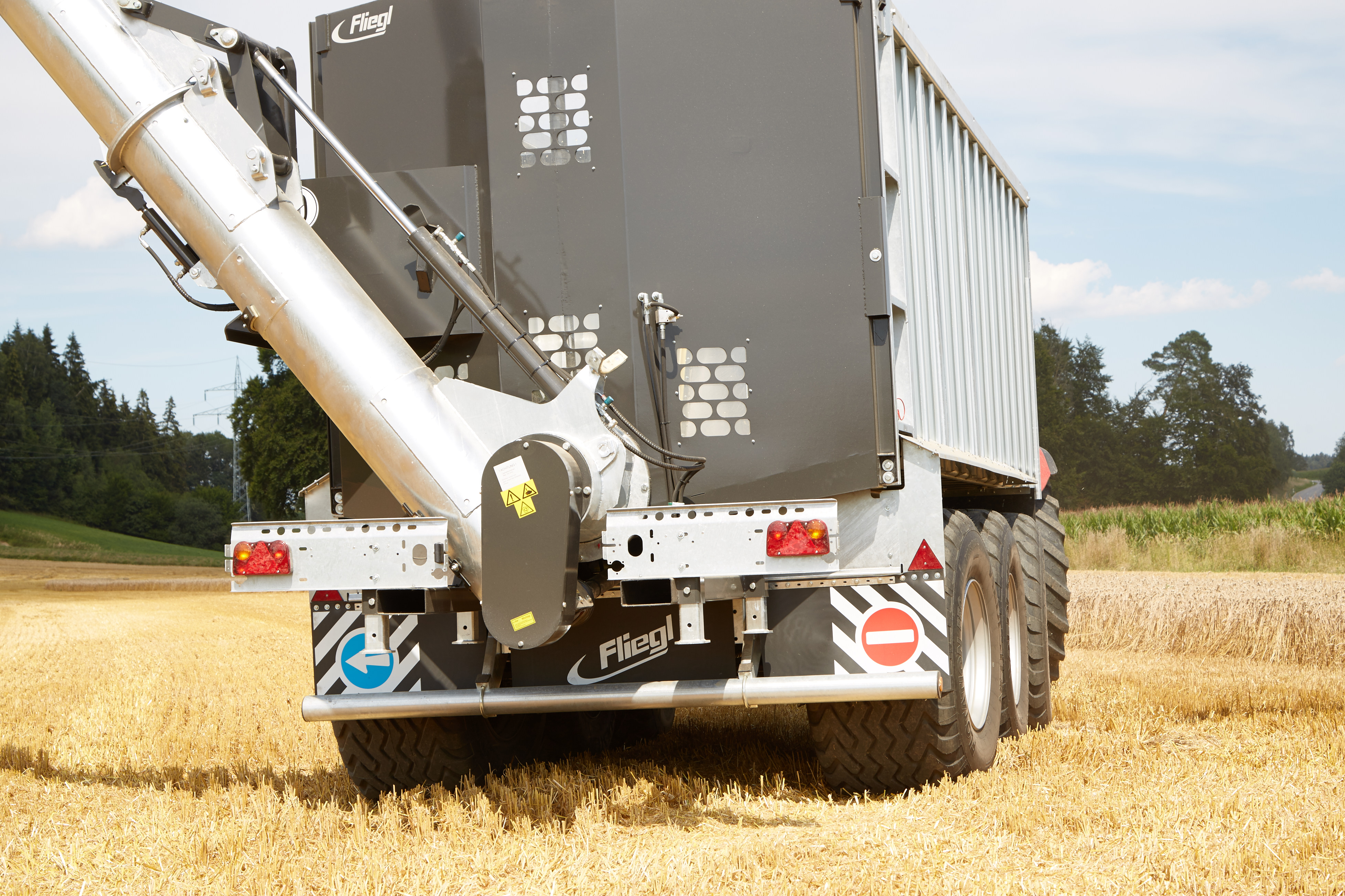 Specifically designed for overloading grain, Fliegl's ÜLS 400 and ÜLS 500 rear augers are capable of transferring at rates of 7,500kg and 10,000kg of grain per minute.
