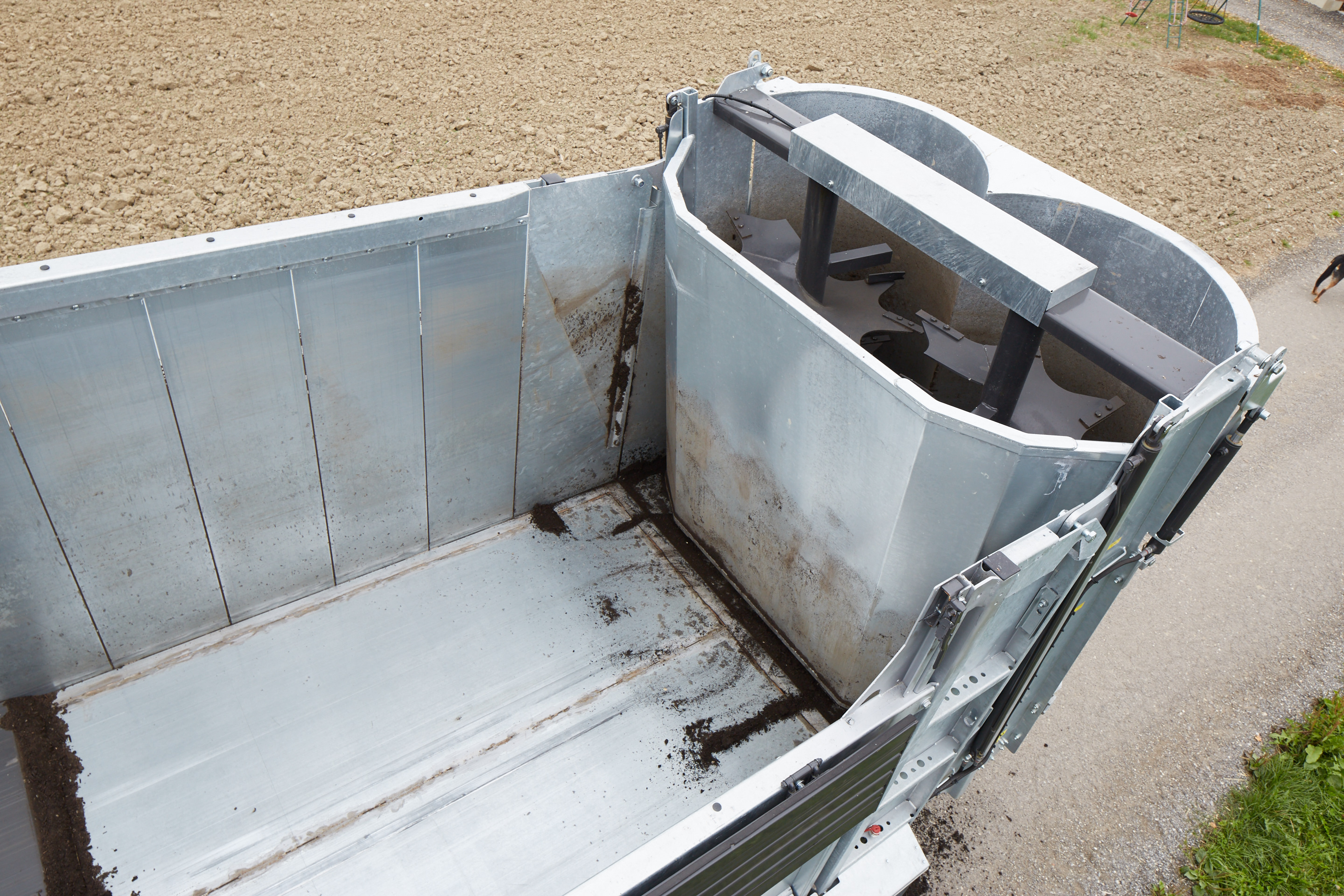 A chassis integrated PTO driveline powers the option of a powerful muck spreader or overloading auger, easily exchanged with the wagons standard transport tail door in 20 to 30 minutes using a telehandler or forklift.